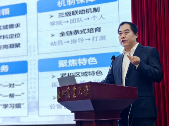 最后,陈庆山校长作总结讲话。他强调,国家科学基金是衡量学校科研实力的重要标志,也是学校支撑农业科技创新、服务国家战略的关键抓手。全校上下要进一步统一思想、提高站位,各学院要针对不同学科特点和教师实际情况,精准施策、分类指导,尤其要聚焦国家战略需求和学科前沿方向,引导教师凝练科学问题,提升选题的创新性与前瞻性。针对2026年的申报工作,他提出三点要求:一是要强化顶层设计。科技处要切实履行牵头抓总职责,谋划好“十五五”国家科学基金的发展规划和目标,制定详实的工作方案,各学院要明确目标任务,落实主体责任,成立专项工作小组,确保申报工作有序推进。二是要打造科研合力,深化对外交流合作。充分发挥学校在北方现代化大农业应用场景方面的丰富实践和深厚积累,加强与国内外高水平高校和科研机构的交流合作,以优势互补、资源共享的协同方式,推动区域创新能力提升,增强核心竞争力。三是推动交叉学科布局。鼓励跨学科、跨学院组建科研团队,依托学校的学科交叉中心,发挥学科间优势互补作用,集中力量攻克高水平科研项目。他希望,全校科研人员以此次会议为契机,凝聚共识,把会议精神转化为申报实效,力争在2026年度国家科学基金申报中取得新的突破,为学校高质量发展和农业科技自立自强注入强劲动能。