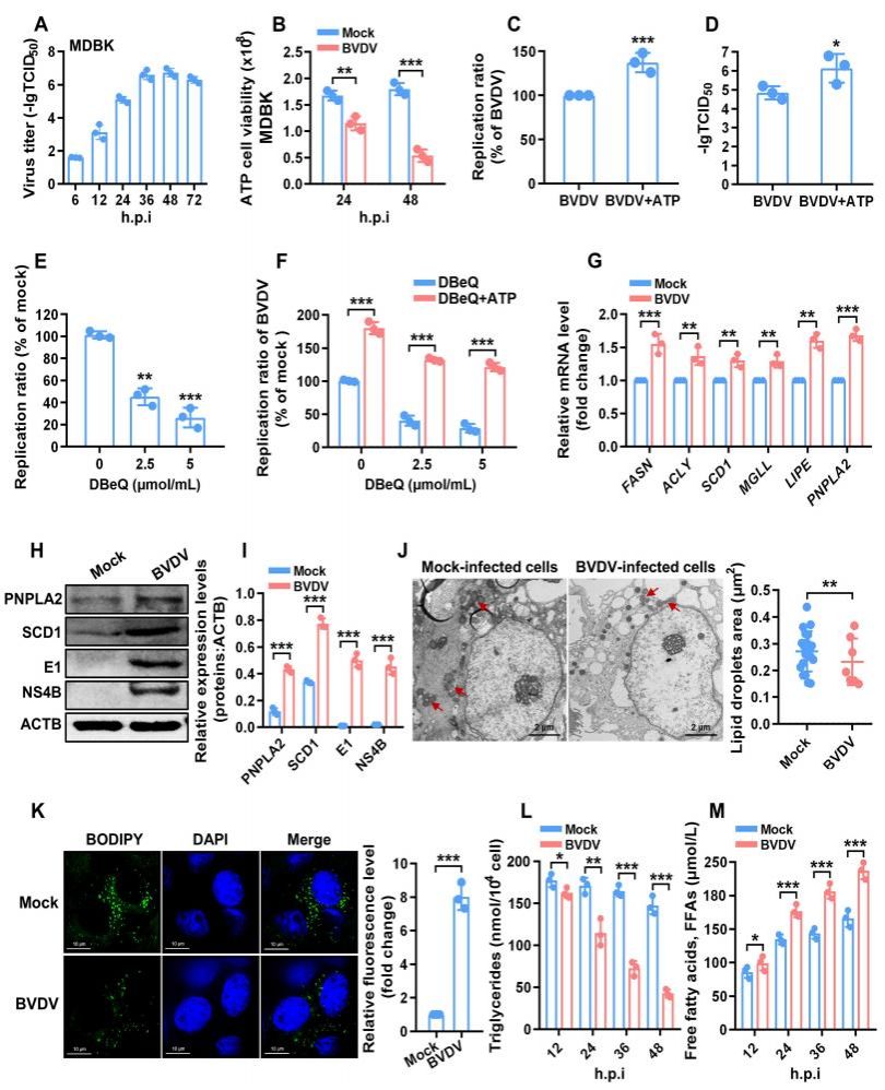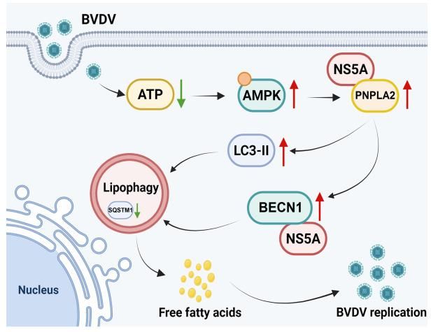 该研究首次阐明了BVDV利用AMPK-PNPLA2信号通路调控脂噬以满足自身复制能量需求的分子机制,不仅加深了对BVDV与宿主细胞代谢相互作用的理解,为开发靶向宿主代谢通路的新型抗病毒策略提供了潜在靶点,也为其他病毒的致病机制研究提供了重要参考。