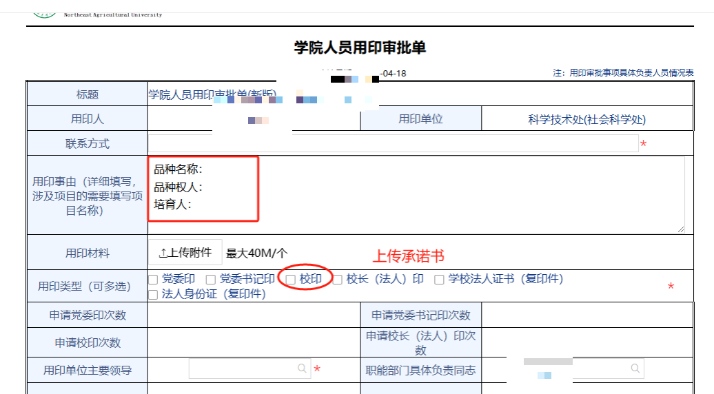 教师登录OA系统后,在OA系统中点击新建流程,在“办公室”栏目下“学院人员用印审批单(新版)”处填写学院审批领导(院长或科研院长),职能部门具体负责同志请填刁婥,如品种权人只有东北农业大学,勾选用印类型,填写用印次数,上传承诺书,用印事由备注品种权人信息和育成人信息。如品种权人还有其他单位,除在备注处填写品种权人信息和育成人信息外,还需补充共同申请佐证材料。若来自纵向项目,请补充纵向项目任务书(任务书中明确知识产权共有)。若来自横向项目,请补充知识产权共同申请审批表(附件1)、横向协议。