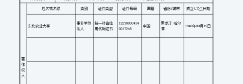 学校师生的职务成果著作权人须为东北农业大学,师生个人不能作为著作权人(如与外单位合作开发,请同时提供横向课题或纵向项目任务书等材料作为共同申请佐证),学校社会信用代码为:122300004140017248。
