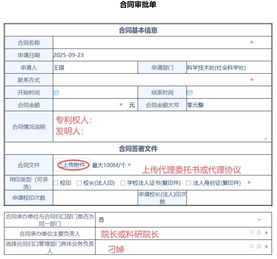 教师登录OA系统后,点击流程-新建流程,在“办公室”栏目下“合同审批流程”处填写合同金额,如专利权人只有东北农业大学,合同情况说明处请备注专利权人信息和发明人信息,合同承办单位与合同归口部门是否为同一部门,请选否,合同承办单位主要负责人为学院审院长或科研院长,职能部门具体负责同志请填刁婥,上传需要用印的代理委托书或协议。如专利权人还有其他单位,除在备注处填写专利权人信息和发明人信息外,还需补充共同申请佐证材料。若专利来自纵向项目,请补充纵向项目任务书(任务书中明确知识产权共有),上传代理委托书或代理协议。专利权人含其他申请单位,且来自横向项目,请下载专利共同审批表(附件1),经社会合作与成果转化中心审核后并上传。