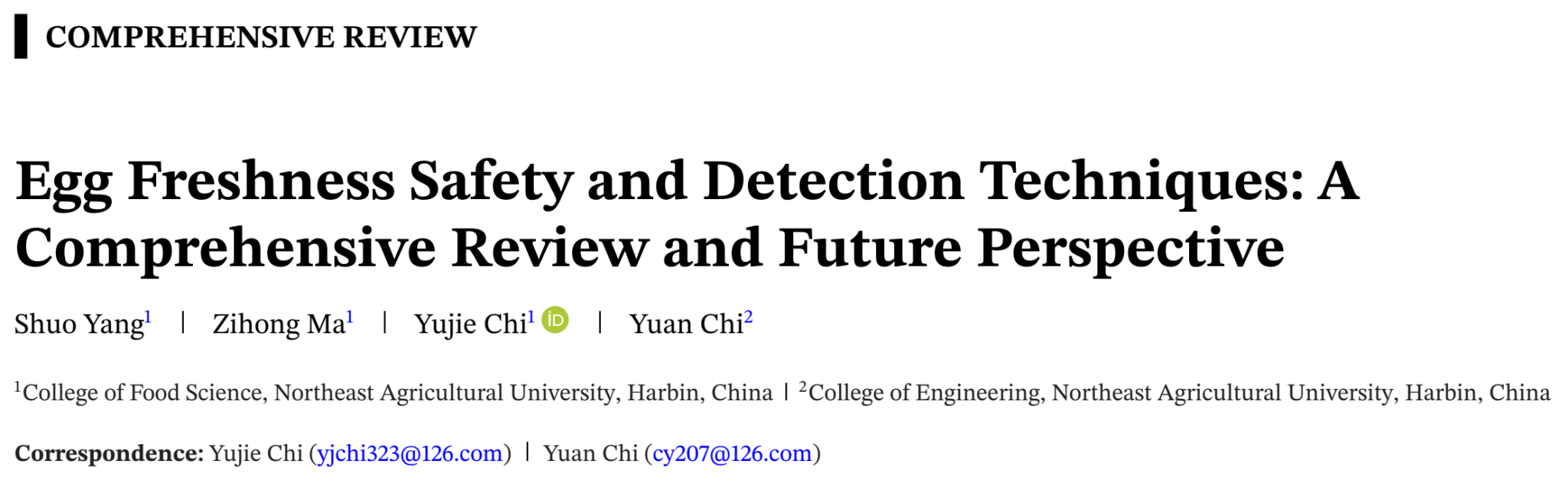 近期,我校食品学院迟玉杰教授、工程学院迟媛教授在国际权威期刊《Comprehensive Reviews in Food Science and Food Safety》(中科院一区TOP,IF: 14.1,IF5: 17.8)联合发表题为“Eggfreshnesssafety anddetectiontechniques: Acomprehensivereview andfutureperspective”的综述论文。迟玉杰教授和迟媛教授为通讯作者,博士研究生杨硕为第一作者,该工作得到了“十四五”国家重点研发计划项目的支持。原文链接:https://doi.org/10.1111/1541-4337.70317。