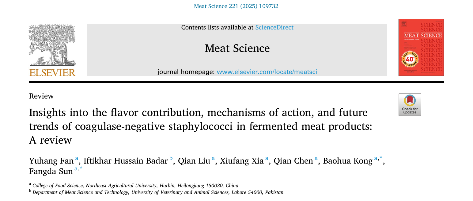肉品在发酵过程中的微生物多样性是其形成独特风味的主要因素,其中凝固酶阴性葡萄球菌是发酵肉制品的品质与风味塑造具有重要影响。2025年3月,博士研究生范宇航作为第一作者、孔保华教授与孙方达副教授作为共同通讯作者在《Meat Science》(论文链接:https://doi.org/10.1016/j.meatsci.2024.109732)上发表了题为“Insights into the flavor contribution, mechanisms of action, and future trends of coagulase-negative staphylococci in fermented meat products: A review”的综述论文。该论文系统综述了凝固酶阴性葡萄球菌在肉制品的作用机制、应用现状及未来发展趋势,为发酵肉制品品质提升与产业化应用提供了科学参考。本研究得到了国家自然科学基金的资助。