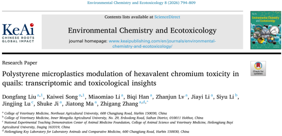 近日,我校动物医学学院张志刚教授团队在《Environmental Chemistry and Ecotoxicology》期刊发表题为“Polystyrene microplastics modulation of hexavalent chromium toxicity in quails: transcriptomic and toxicological insights”的研究论文。该研究系统阐明慢性暴露于聚苯乙烯微塑料通过加剧六价铬诱导的鹌鹑体内脂质代谢失调,进而加重肾纤维化进程。这一成果不仅丰富了环境中微塑料与重金属复合污染致畜禽肾损伤的分子机制,更为动物源性食品安全保障策略的制定提供了重要科学支撑。