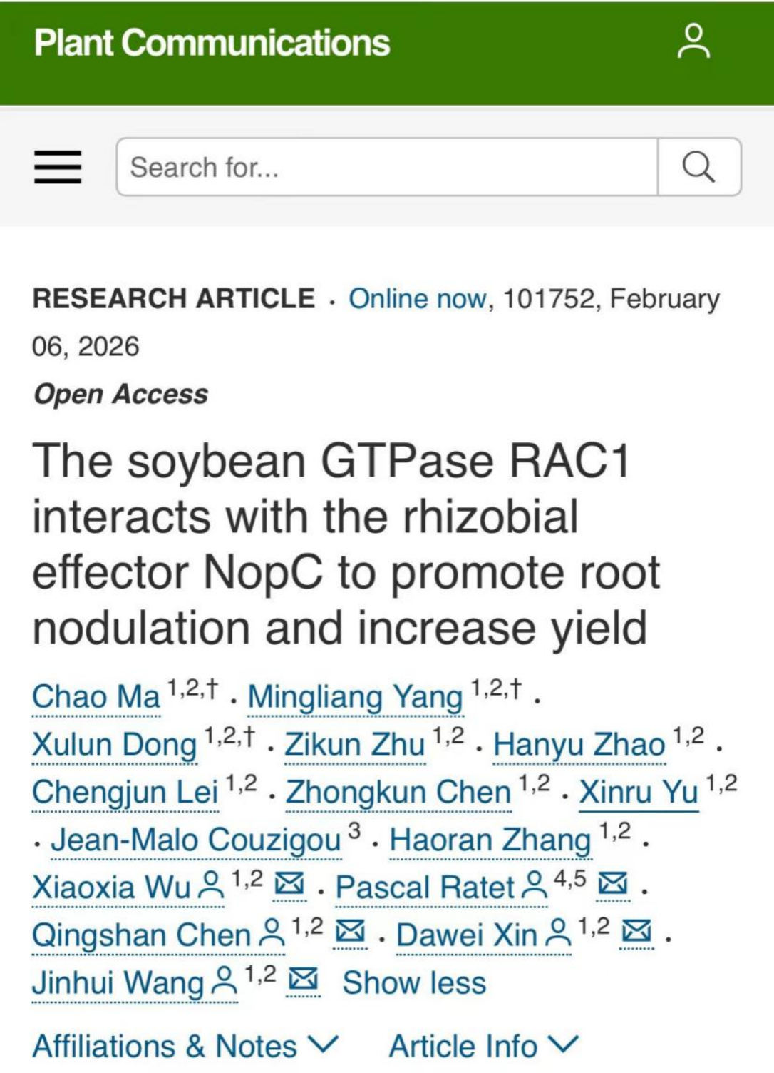 近日,我校农学院智慧农场技术与系统全国重点实验室陈庆山教授团队辛大伟、王锦辉课题组在植物顶级期刊《Plant Communications》(影响因子11.6)上发表题为“The soybean GTPase RAC1 interacts with the rhizobial effector NopC to promote root nodulation and increase yield”的研究论文。该研究揭示了广宿主根瘤菌Sinorhizobium frediiHH103的III型效应因子NopC通过与GmRAC1互作影响共生信号传递,进而影响大豆与根瘤菌共生建立。