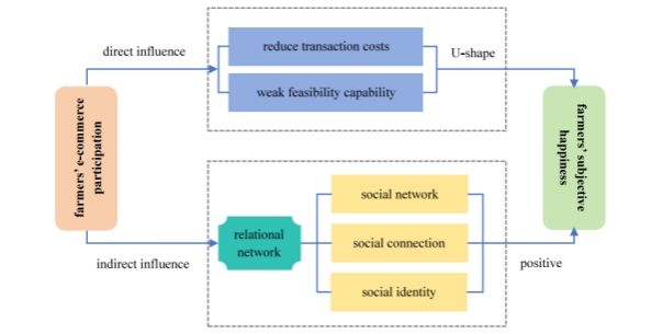 该研究与以往研究遵循的“电商参与—收入增加—幸福感提升”这一逻辑不同,将视角转向非经济因素,主要考察农民电商参与的幸福效应。利用2020年中国乡村振兴综合调查(CRRS)数据,探究农民电商参与如何影响关系网络进而增进幸福感。结果发现,农民电商参与对其幸福感的影响呈现显著的“U”型关系,即当农民电商参与程度跨越拐点以后才可显著提升幸福感。这种影响关系在经过内生性处理、稳健性检验后依然成立。机制检验发现,农民电商参与有助于拓展社会网络、增强社会联结、提升社会认同进而增进幸福感。文章进一步分析“谁从电商参与中获得更多幸福感”以及“如何参与电商能获得更多幸福感”发现,西部地区和东北地区农民参与电商增进幸福感更为显著,销售单一类农产品的农民幸福感提升更为明显。农民转变观念、抱团取暖、做优品牌,可以获得更多幸福感。文章拓展了“数商兴农”的理论边界,从非经济因素层面打开“农民电商参与—幸福感”之间的“黑箱”,为政策优化提供了靶向方案。