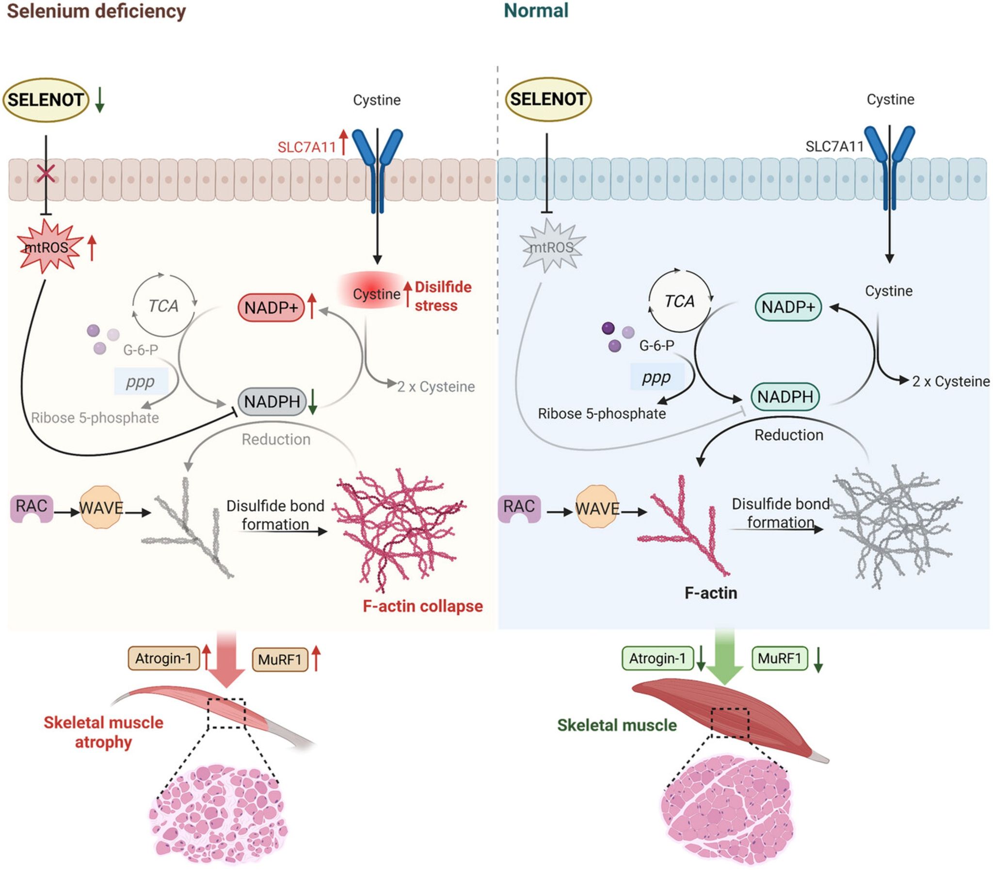 本研究确立了SELENOT/mtROS/NADPH轴在硒缺乏诱导肌肉萎缩中的关键作用,为肌肉消耗性疾病提供机制见解。该发现系统阐明SELENOT在硒缺乏诱导肌肉萎缩中的作用机制,不仅有助于揭示肌肉消耗性疾病的病理基础,也将为开发靶向治疗策略提供重要理论依据。