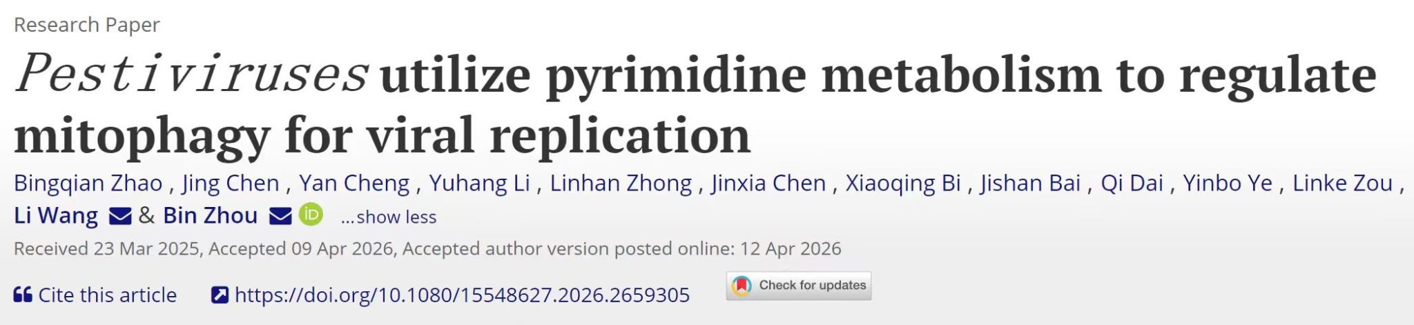 近日,我校周斌教授团队在国际权威期刊《Autophagy》(影响因子14.3,中科院1区TOP期刊)发表了题为“Pestiviruses utilize pyrimidine metabolism to regulate mitophagy for viral replication”的研究论文。该研究系统阐明了二氢乳清酸脱氢酶(DHODH)在动物瘟病毒(CSFV)等黄病毒科病毒复制中的关键调控作用,揭示了病毒通过调控宿主细胞嘧啶代谢-自噬轴促进自身复制的新机制,对新型抗病毒药物的开发具有重要的理论与现实意义。周斌教授和王丽副教授为共同通讯作者。